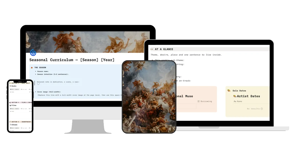 Each season you'll curate your own curriculum of books, films, albums, exhibitions, shows, artist dates and more. You'll choose a seasonal muse. You'll track the lunar calendar and key astrological transits. Declare how you'll give back. Document quotes and photos. Explore a new knowledge system or spiritual technology. The options to deepen and personalise your seasonal curriculum are endless.